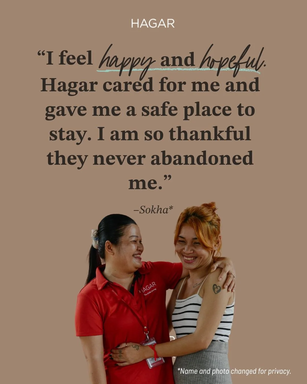 Donations of $2 and over to Hagar Australia Overseas Aid Fund (ABN 20 159 198 535) have Deductible Gift Recipient (DGR) status with the Australian Tax Office. Funds will be used to improve the lives of women and children who have been trafficked, enslaved or abused. Your personal information is handled in accordance with our privacy policy. | other policies